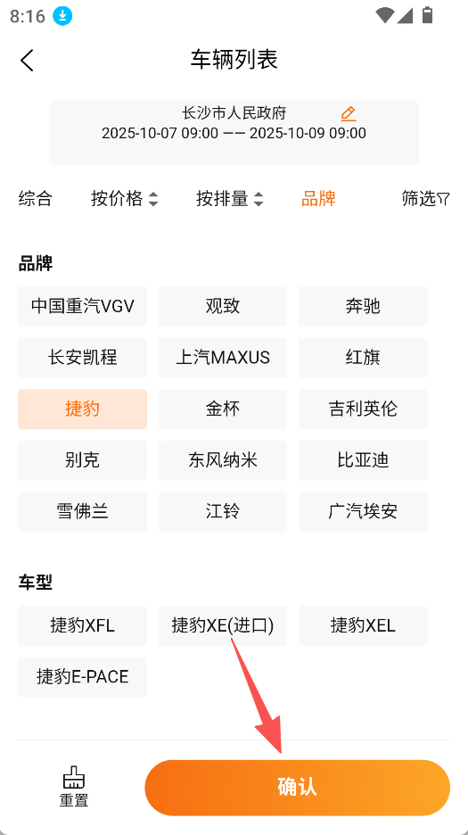 2、在车辆列表页,按综合、价格等条件筛选车辆,选好后点击确认。
