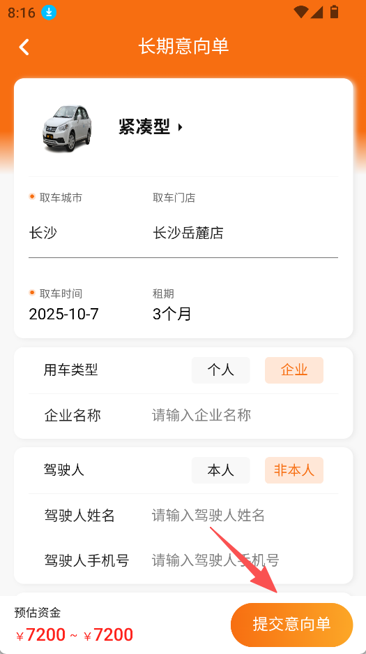 3、支持填长期意向单,录取车信息、选用车类型和驾驶人,填好相关内容后可提交意向单。