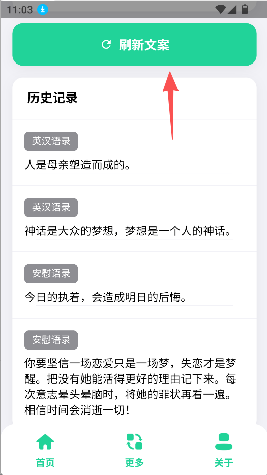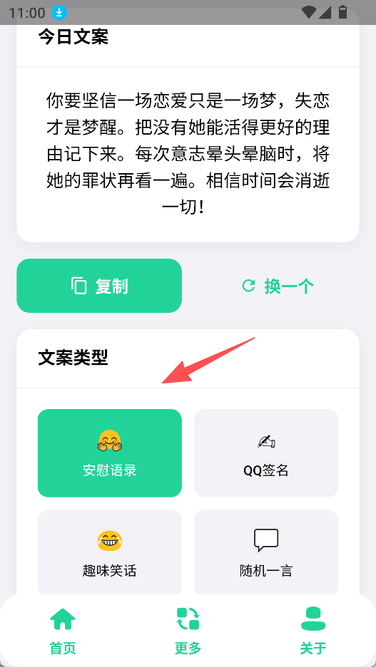 2、可选择不同文案类型,如安慰语录等,获取对应类型的文案,满足特定场景文案需求。