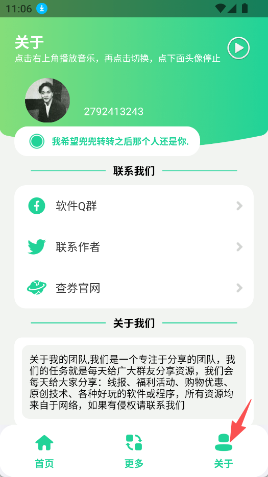 3、点击关于,可查看团队相关介绍,还能通过软件Q群、联系作者等方式进行互动。