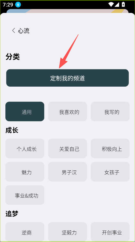 1、点击定制我的频道,可选择通用我喜欢的等分类,以及成长、追梦等领域内容。