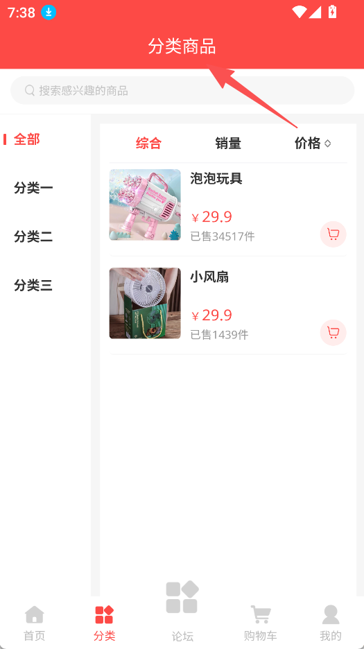 1、进入分类页面,可搜索商品,按综合、销量、价格排序,挑选心仪商品。
