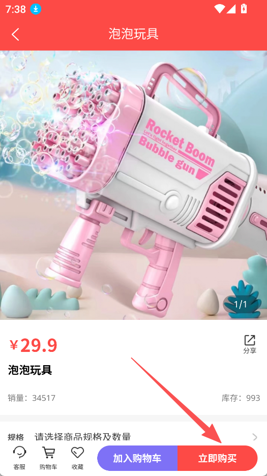 2、点击商品进入详情页,能查看价格、销量等,选择加入购物车或立即购买。