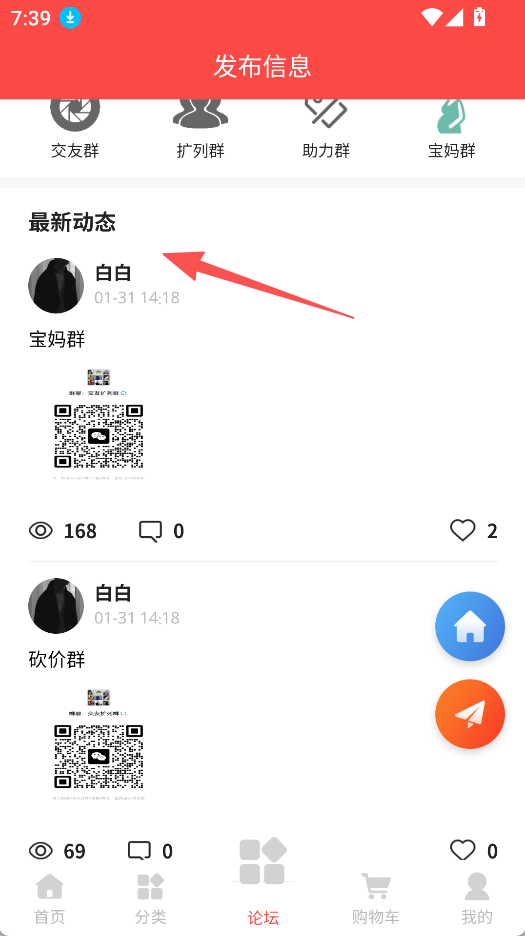 3、进入论坛板块,可发布信息,查看交友群、扩列群等群组的最新动态,参与社交互动。