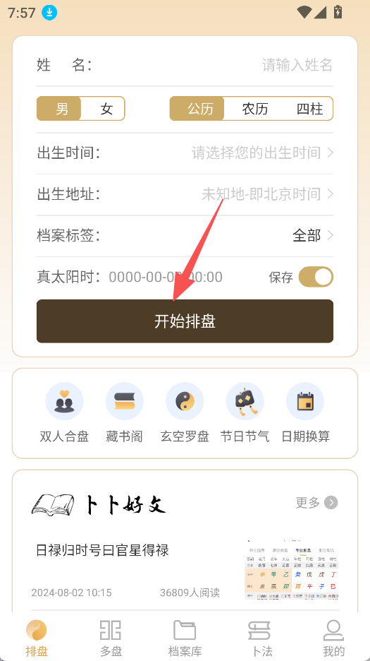 1、输入姓名,选择性别、出生时间等,点击“开始排盘”进行排盘。