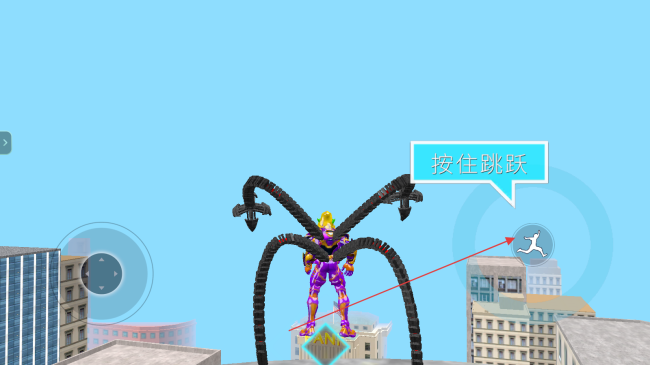 1、在城市建筑间,看到【按住跳跃】提示时,长按对应跳跃按钮,操控角色跳跃,跨越建筑间的距离。