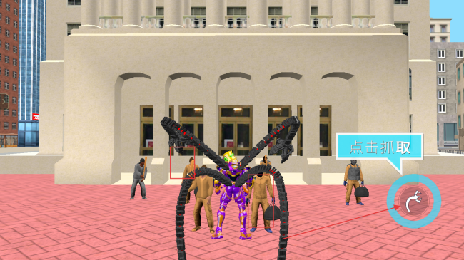 2、遇到目标人物,依据【点击抓取】提示,点击抓取按钮,用角色的机械臂等装置抓取人物,完成交互。