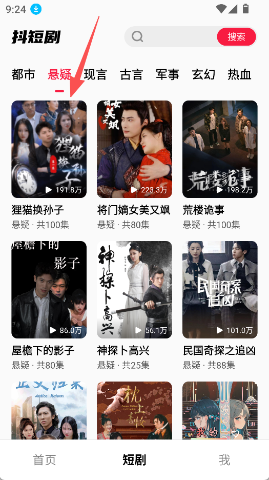 3、切换到短剧板块,选择都市、悬疑等分类,挑选短剧观看。