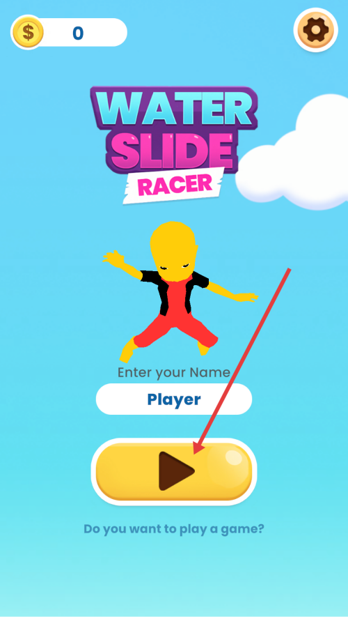 1、进入游戏界面,看到【WATER-SLIDE-RACER】标题后,点击黄色开始按钮,即可开启水上滑道竞速游戏。