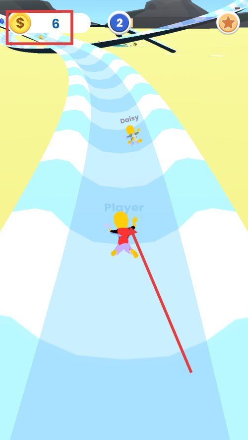 2、在滑道上滑行时,注意收集金币,上方显示的金币数会增加,同时要追赶前方的对手,争取领先。