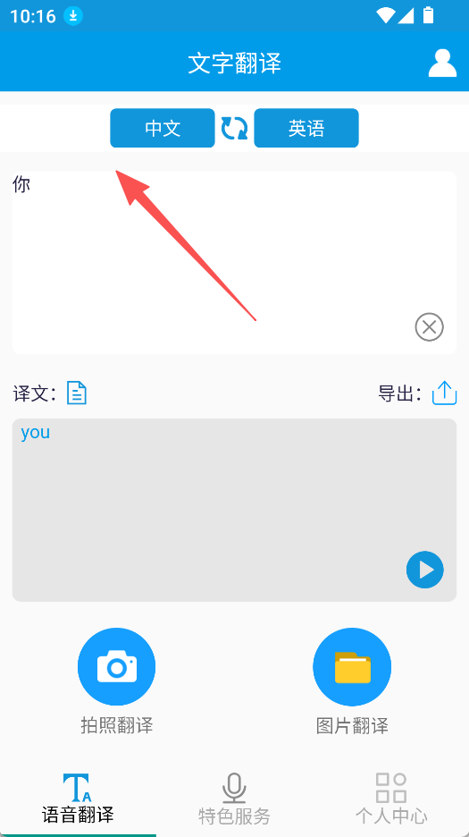 1、支持文字翻译,进入文字翻译,选择语言,输入文字,可查看译文并导出。