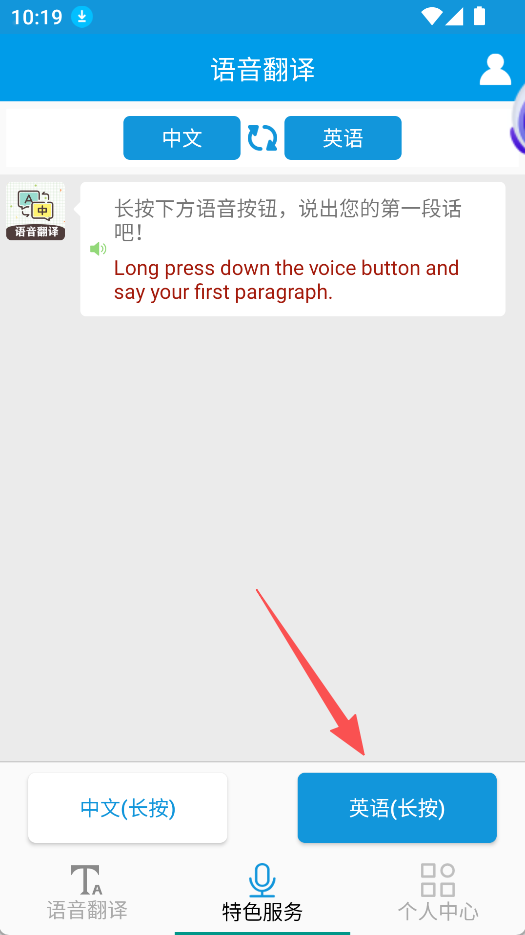 2、如需语音翻译,进入语音翻译,长按对应语言按钮,说出内容进行翻译。