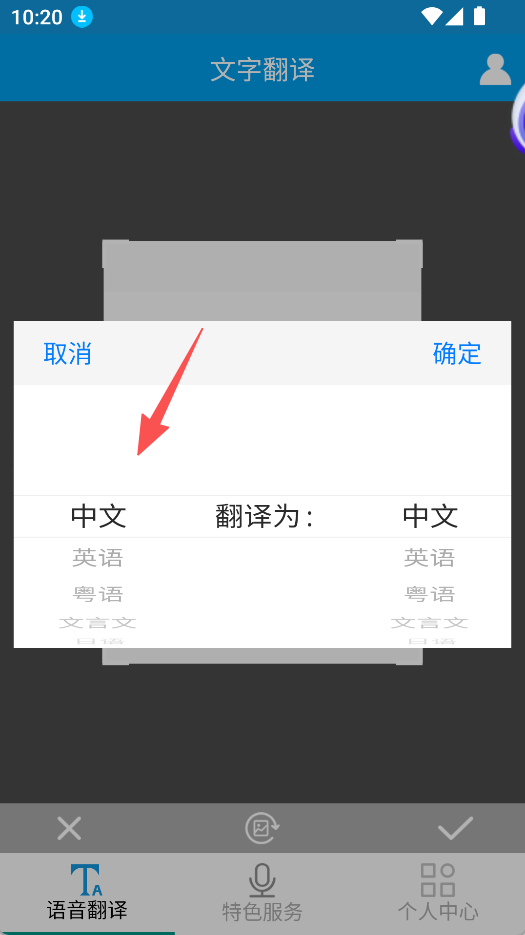 3、若要翻译图片,可选择拍照翻译或图片翻译,也能在语言选择中切换目标语言。