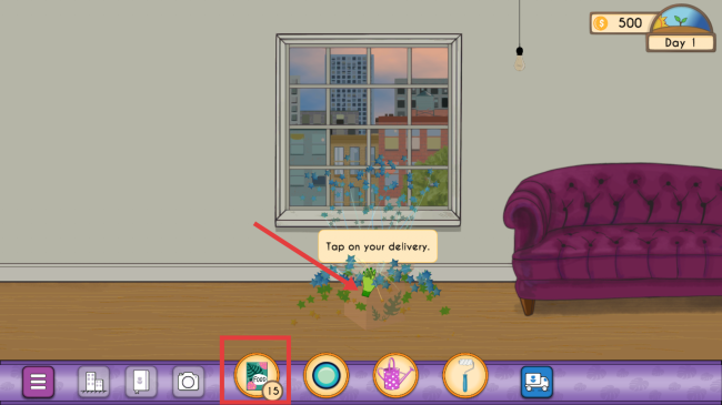 2、Day-1时,看到提示点击对应区域接收植物,同时可查看下方道具栏,为后续操作做准备。