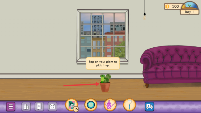 3、根据提示点击盆栽植物,将其拿起,熟悉植物拾取的操作方式。