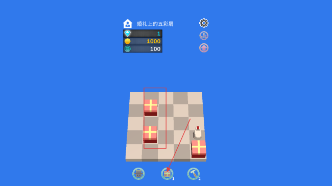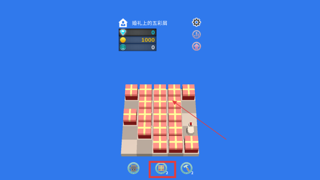 1、进入“婚礼上的五彩厢”关卡,初始有1000金币,可使用下方道具,点击红色箭头指向的礼盒区域,触发礼盒相关操作。