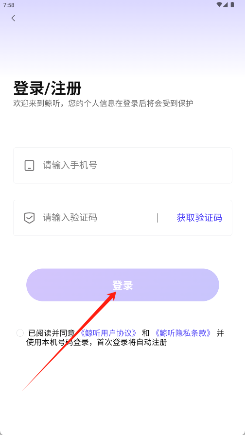 1、在登录页面输入手机号与验证码后,勾选同意协议条款,点击“登录”。