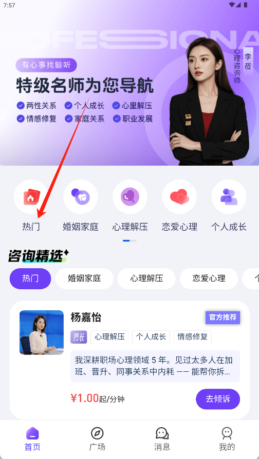 《鲸听》是一款专注于在线心理咨询服务的平台。软件界面以紫色为主色调,涵盖两性关系、个人成长、心理解压等六大常见咨询领域。直观呈现服务分类与推荐咨询师,并清晰标注其专长领域与分钟计费起点。结构简洁,包含首页、广场等核心入口。该平台通过清晰的领域划分、透明的资费展示与专业的咨询师资源,为有心理倾诉需求的人士提供直接、便捷的专业服务对接渠道。