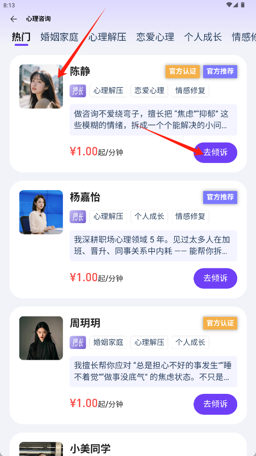 3、在“咨询精选”区域选择咨询师点击卡片上的“去倾诉”按钮即可进入预约流程。