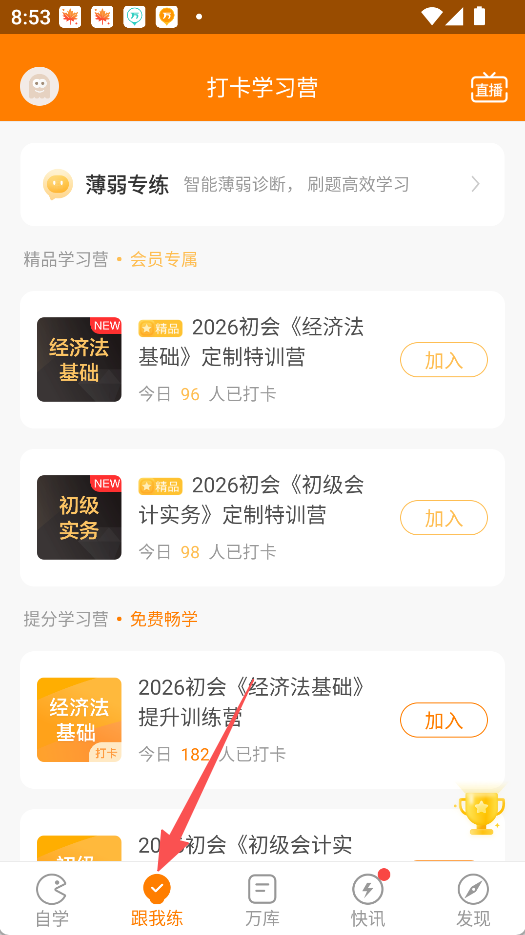 1、点击跟我练,选择目标打卡学习营。