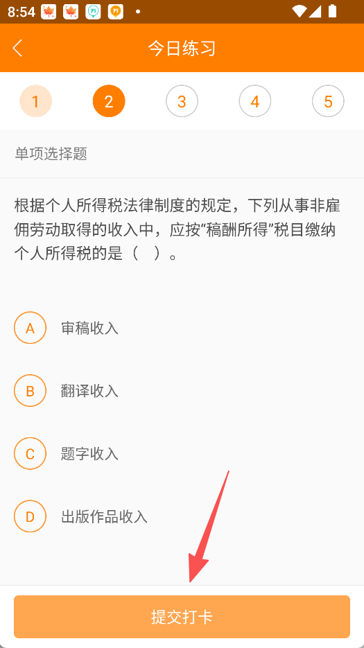 3、在今日练习页面完成题目,点击提交打卡。