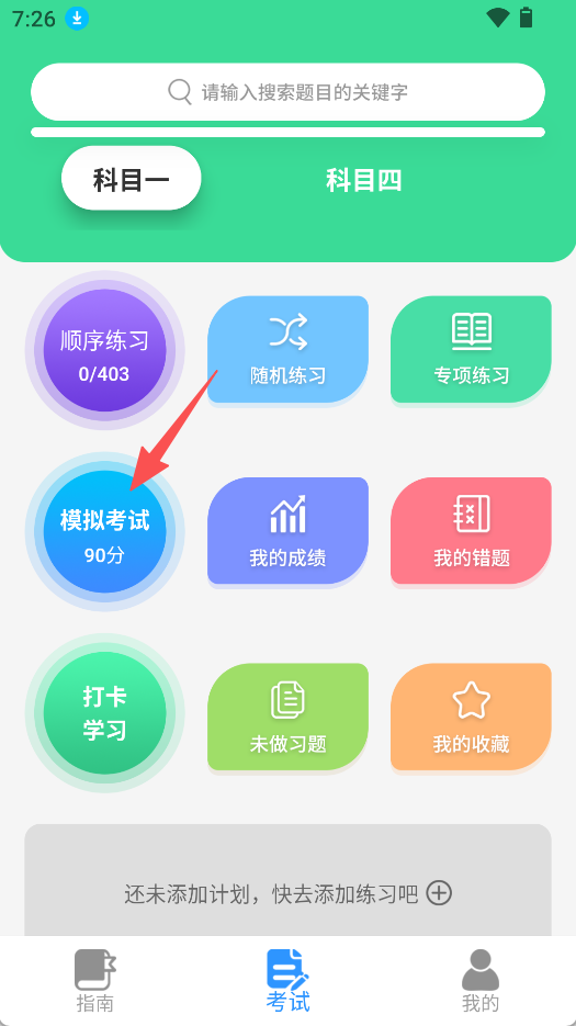 1、打开《摩托车驾照增驾通》,点击“模拟考试”。