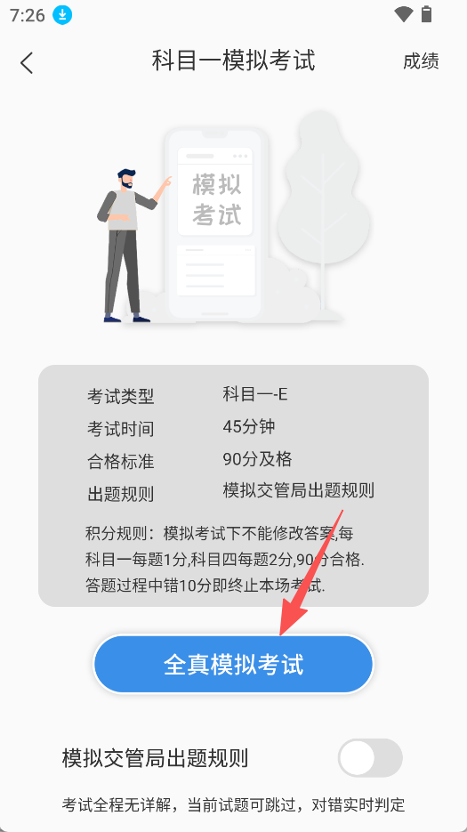 2、进入科目一模拟考试页面,点击“全真模拟考试”。