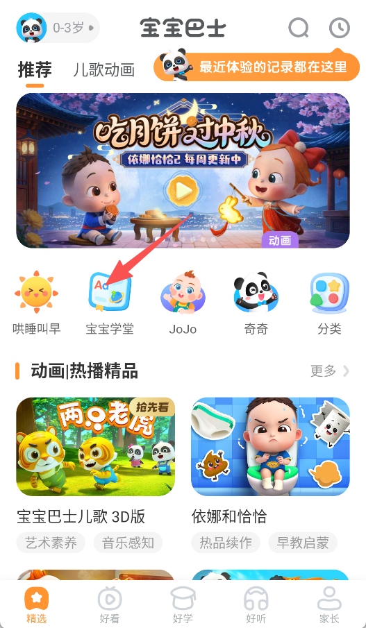 1、打开《宝宝巴士》,点击宝宝学堂。