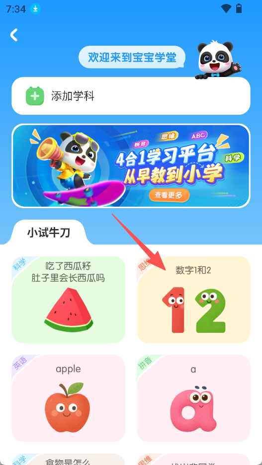 2、进入宝宝学堂,点击数字1和2。
