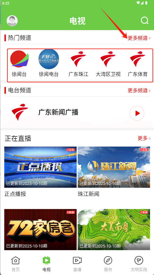 3、在电视页面可浏览“热门频道”列表,选择“徐闻台”等频道观看直播或回放内容。