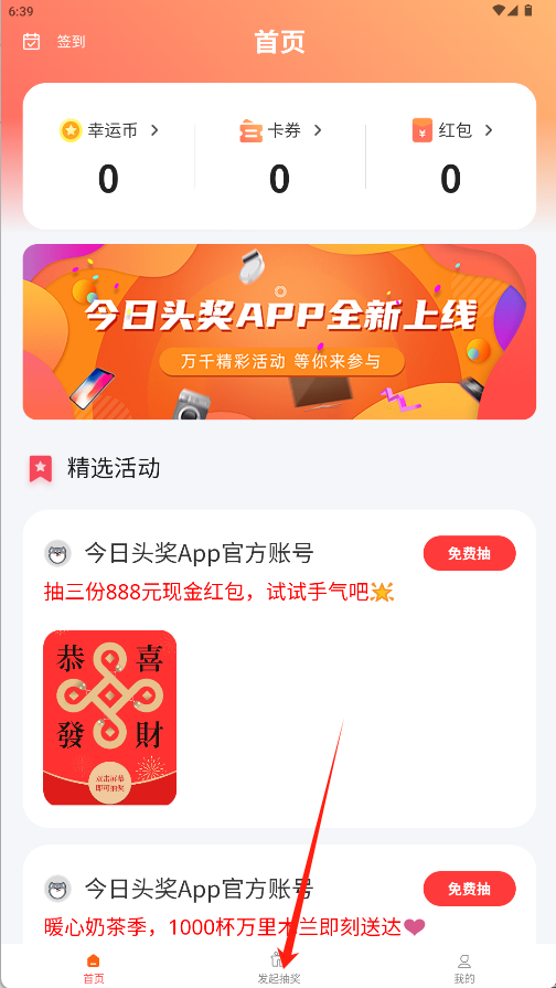 2、进入首页后,点击底部导航栏的“发起抽奖”选项。