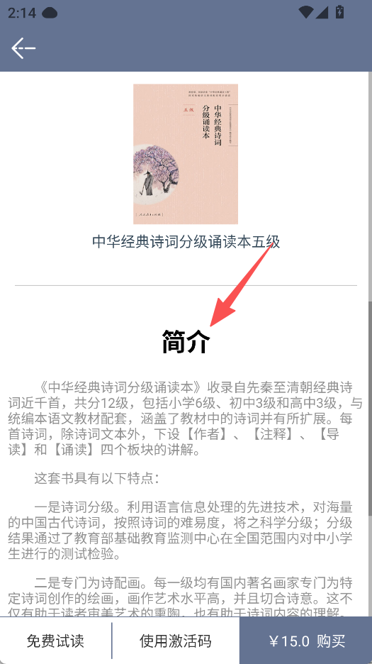 2、进入读本页面,查看简介了解诗词收录及讲解板块。