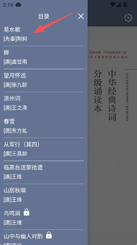 3、打开目录,选取诗词(如易水歌)进行学习。