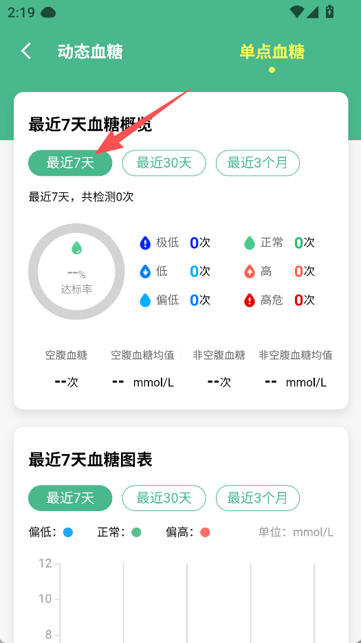 2、进入后切换动态或单点血糖,选择最近7天等时间范围查看血糖情况。