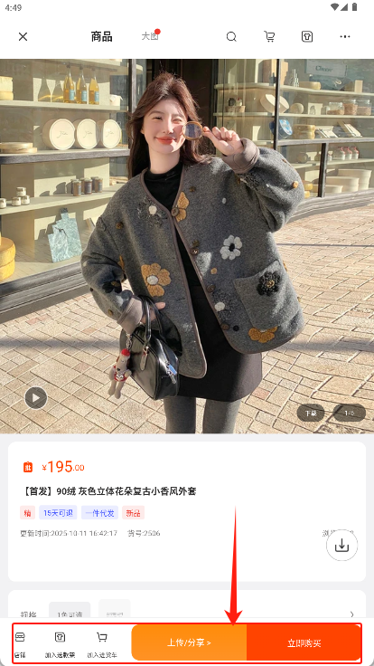 3、进入商品详情页查看信息后,点击底部“上传/分享”按钮即可分享或上传商品与“购买”。
