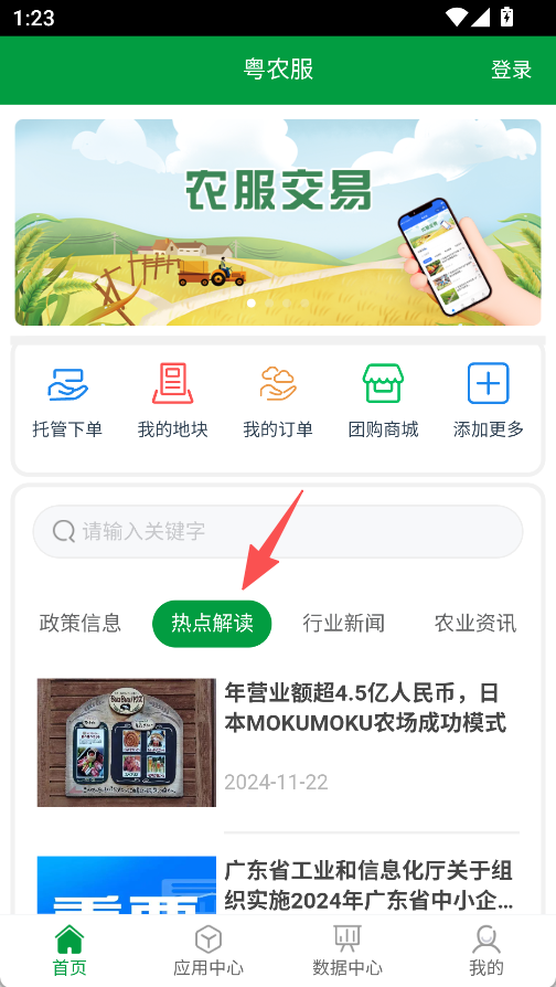 3、在首页资讯区域点击热点解读,查看农业案例的详细内容。