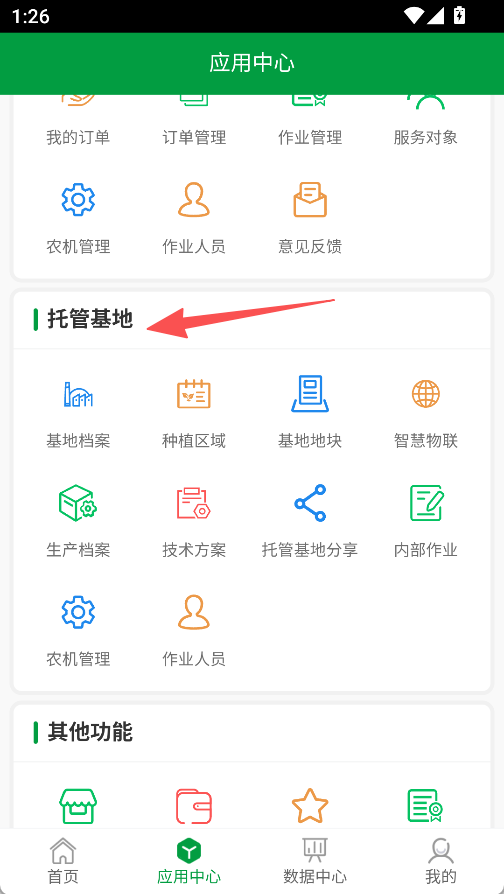 2、进入应用中心,找到托管基地板块,点击基地档案完善地块信息。