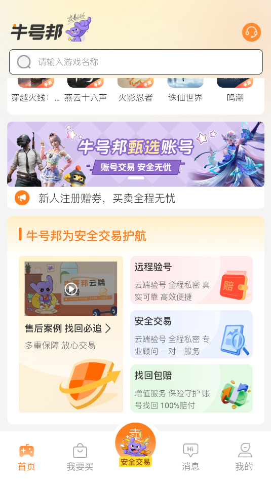 牛号邦是一款专业游戏账号交易平台,覆盖200余款热门端游与手游,提供丰富账号资源选择。搭载云端实时验号系统,交易中可同步查看验号进程,保障信息安全与真实,杜绝虚假账号。平台提供担保交易、账号估价、回收及装备道具流通服务,配备合规交易合同与全流程监控。24小时专属客服响应纠纷,账号异常时启动找回赔付机制,为交易全程护航,让账号买卖更安心高效。