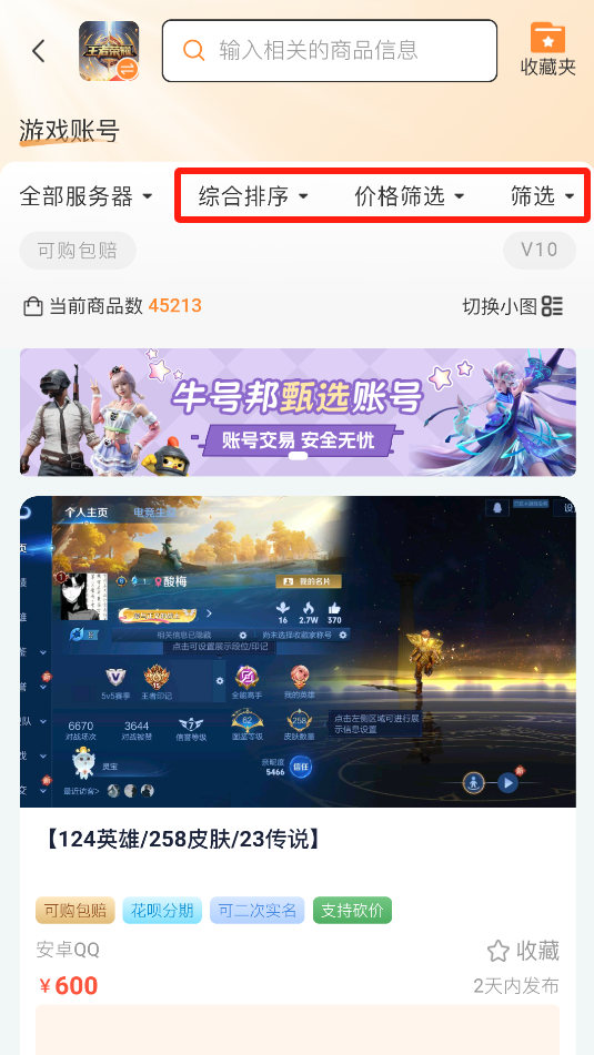 3、找到的游戏,界面中会呈现非常多的账号信息,价格,皮肤等,可以通过价格筛选查找合适的价格。