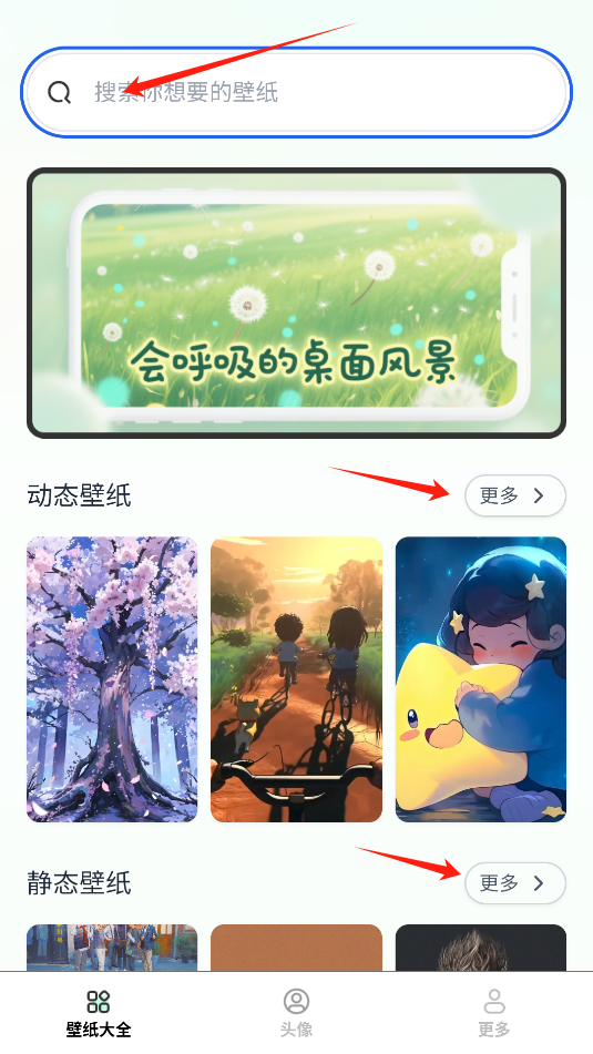 1、打开软件,可以在搜索框输入关键词,搜索相关的壁纸,下方还分有动态壁纸和静态壁纸。