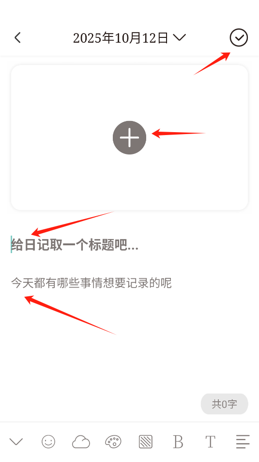 3、日记页面,可以点击加号添加心情照片,写好日记题目,在下面输入日记内容,点击右上角的打钩即可。