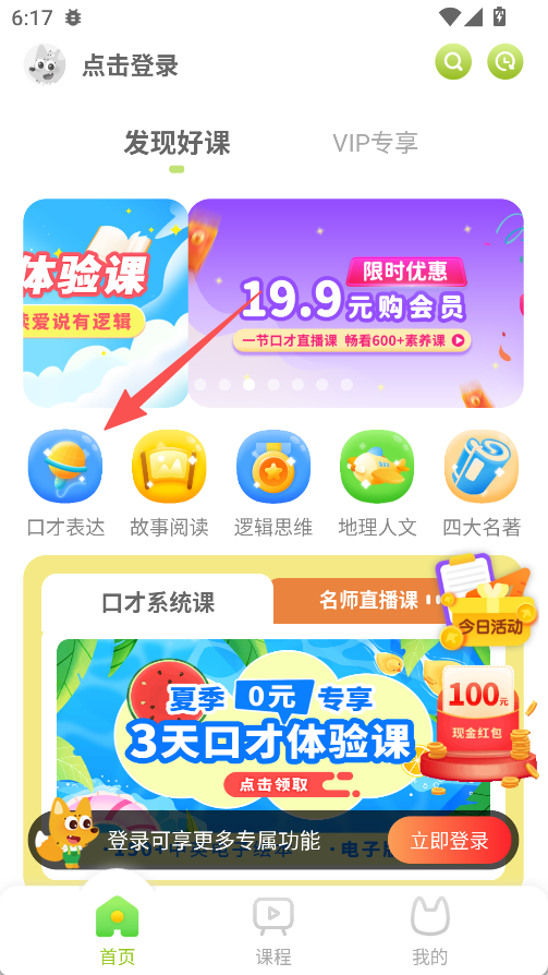 1、设置多类别学习入口,首页有口才表达、故事阅读等分类按钮,可直接进入对应学习板块。