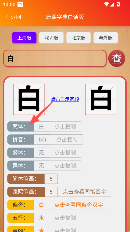 3、点击单个汉字,查看该字的简体、拼音等详细信息。