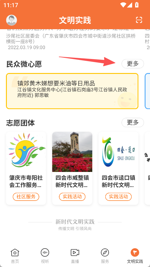 3、点击底部文明实践”,再点击民众微心愿旁的更多。