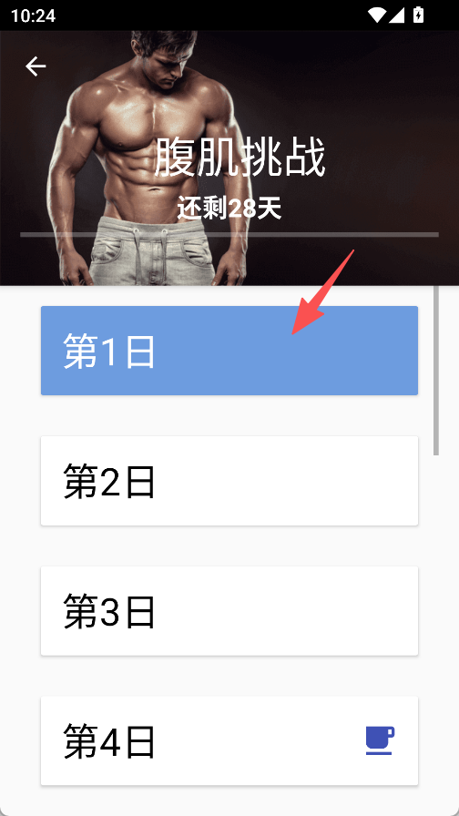 2、进入腹肌挑战页面,点击“第1日”。
