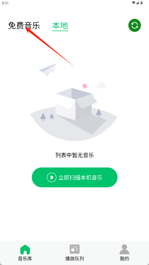 1、在本地页面点击指向的绿色“免费音乐”按钮。