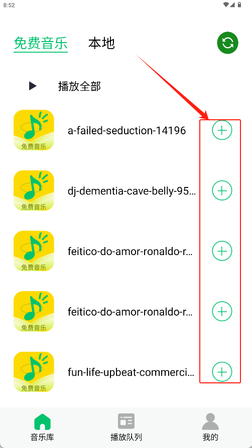 2、点击每首歌曲右侧的绿色“+”按钮,将歌曲添加到播放列表。