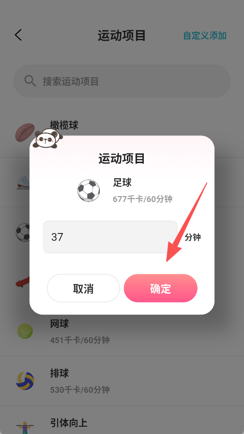 2、运动记录项目多,有足球、网球等可选,还可设置时长,全面记录运动消耗情况。