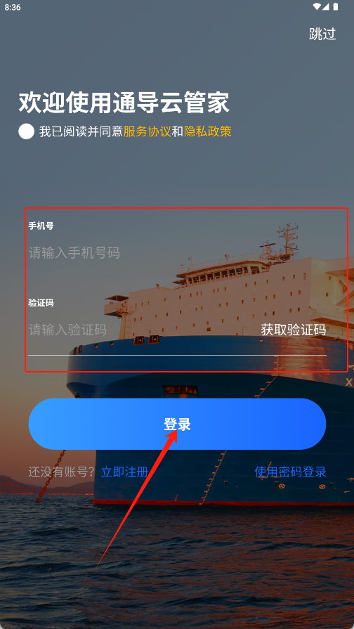 1、在登录界面输入手机号获取验证码,勾选同意协议后点击“登录”完成。