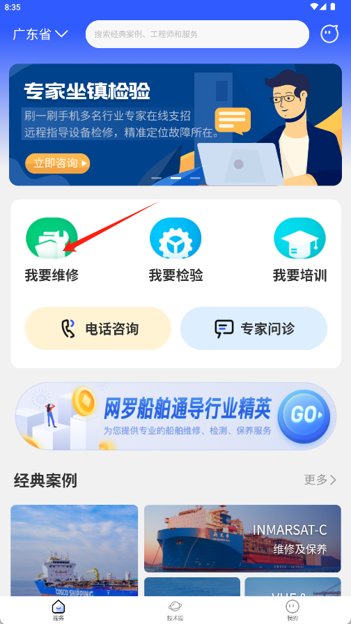 1、采用清晰的三入口功能设计,首页直接展示我要维修、我要检验、我要培训三大核心服务模块。